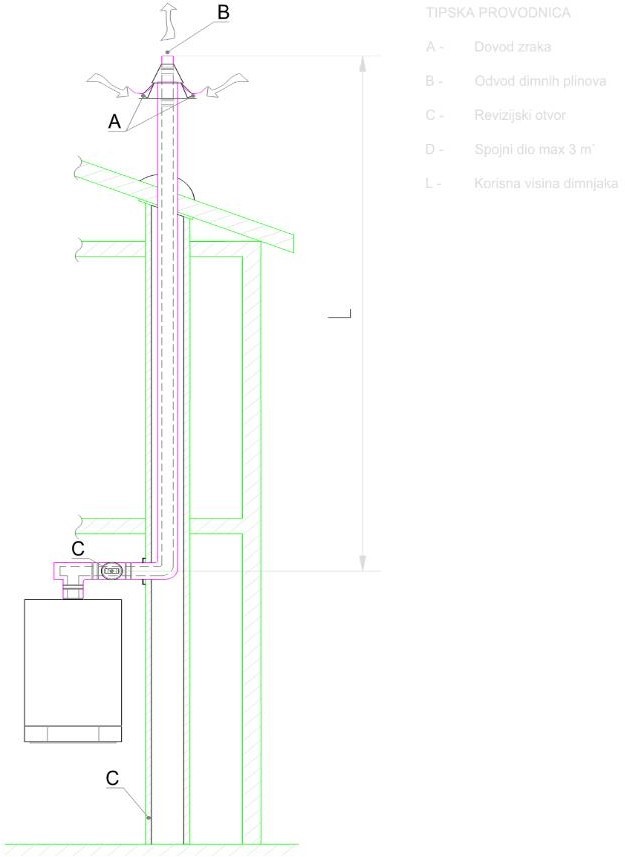 Den vorhandenen Schornstein nutzen wir nur als Bauschacht, durch den wir die Rauchrohre für die Luftzufuhr zum Kessel und die Abfuhr der Rauchgase führen (Abbildung 1). Je nach Art des von uns installierten Kessels müssen der horizontale Abstand zum Schornstein und die vertikale Höhe des Schornsteins berücksichtigt werden. Zertifizierte Schornsteine erlauben je nach Hersteller einen horizontalen Abstand von bis zu 3 m` und eine vertikale Höhe von mehr als 12 m`. Liegen uns andere Parameter vor, ist es zwingend erforderlich, den Lieferanten um eine Schornsteinberechnung zu bitten, aus der hervorgeht, dass sie die gegebenen Bedingungen erfüllen.