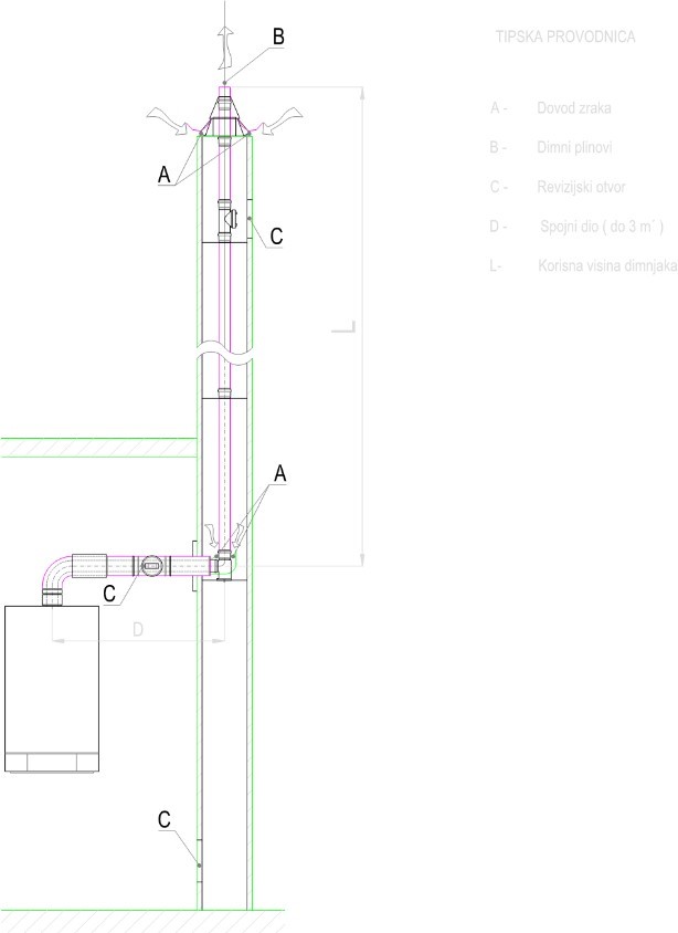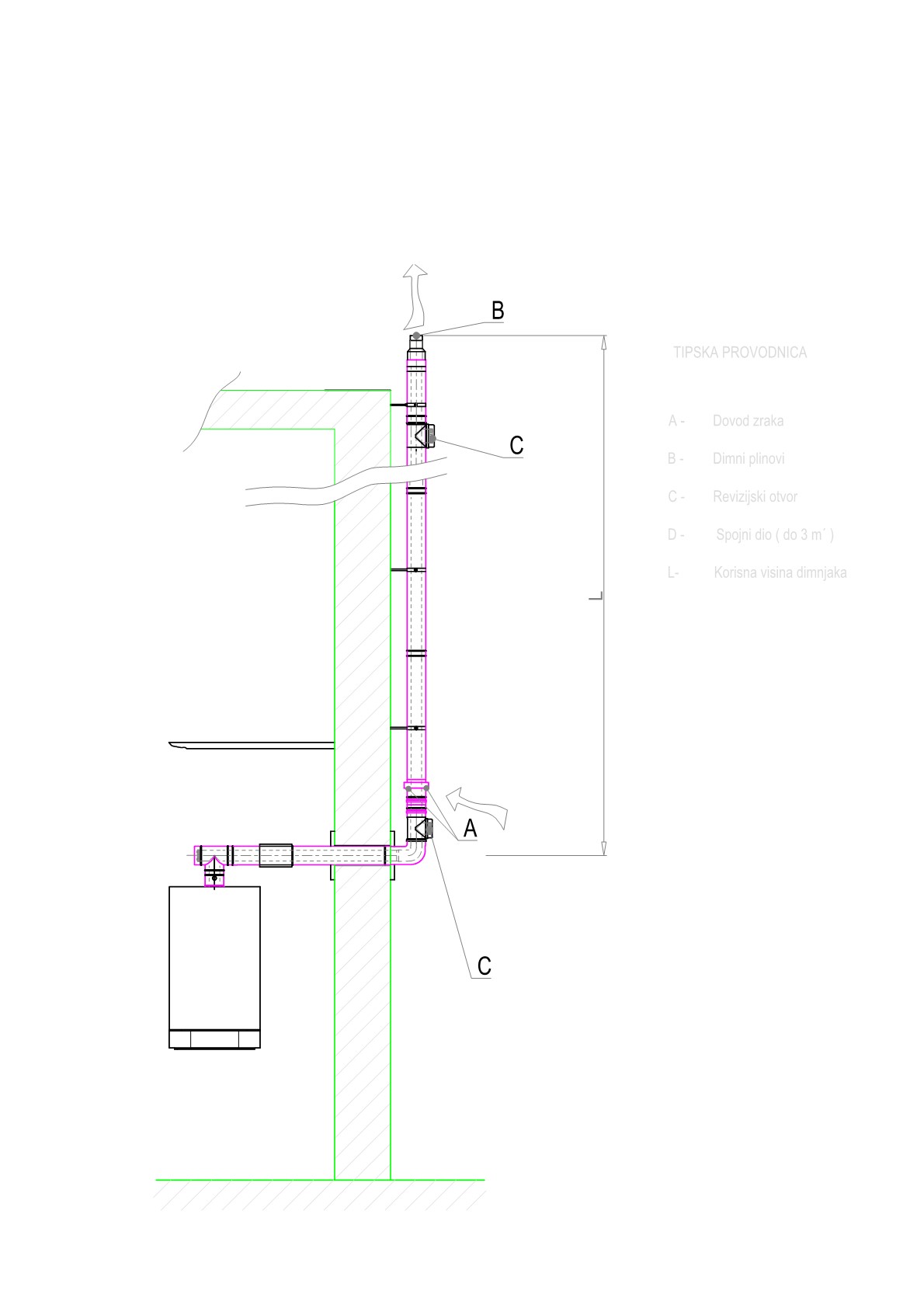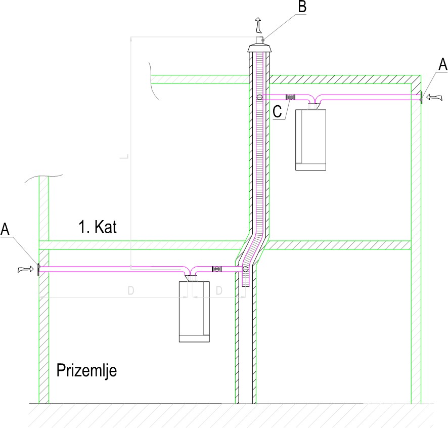 Für den Fall, dass wir die Verbrennungsluft nicht durch den Bauschacht oder durch Rohre vom Dach des Gebäudes führen können, besteht auch die Möglichkeit, Luft durch separate Rohre von der Fassade des Gebäudes zuzuführen (Abbildung 3).