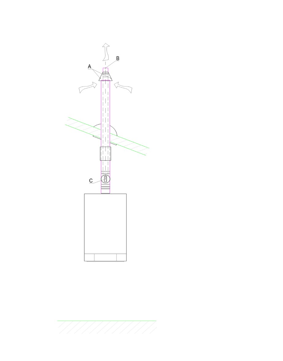 Zusätzlich zu den oben genannten Möglichkeiten und je nach Aufstellungsort des Kessels ist es möglich, den Schornstein entlang der Fassade zu ziehen oder, wenn er sich im Dachgeschoss befindet, direkt durch das Flach-/Schrägdach (Abbildung 5). Wenn der Schornstein entlang der Fassade verläuft, kann die Ansaugung vom Dach oder von der Seite des Gebäudes erfolgen (Abbildung 4).